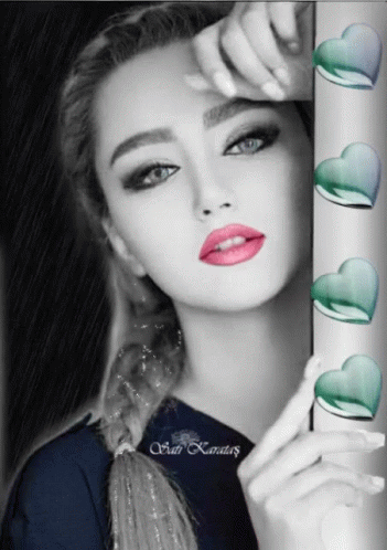 Nasserq presents a beautiful portrait of Sati Karataş, a woman with pink lips and green hearts, in black and white.