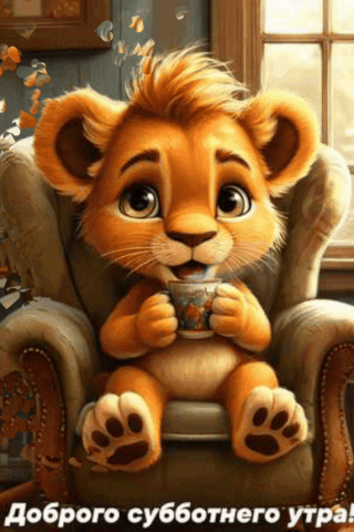 Cute animated lion cub sitting in an armchair, holding a cup of coffee, with a 'Good Saturday morning!' message.