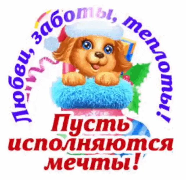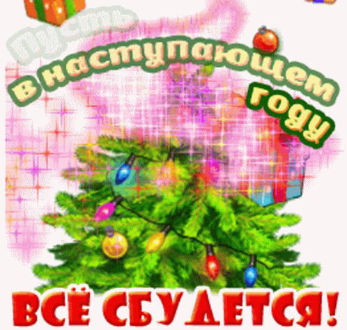 Animated New Year's greeting card with a decorated Christmas tree, sparkling gifts, and a festive message in Russian.
