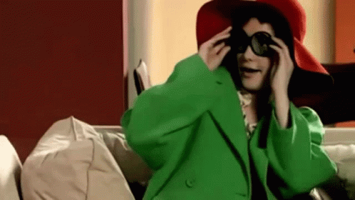 Natalia Oreiro in a green coat and red hat, looking through goggles with a surprised expression.