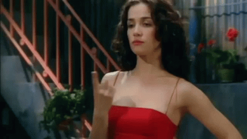 Natalia Oreiro in a red dress, standing by stairs and giving the middle finger.