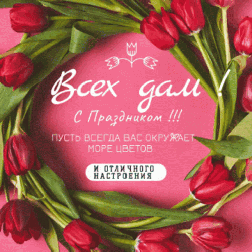 Natella's festive greeting for International Women's Day, surrounded by a wreath of red tulips and warm wishes.