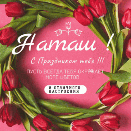 A beautiful greeting for Natella on March 8th, featuring a wreath of red tulips and warm wishes.