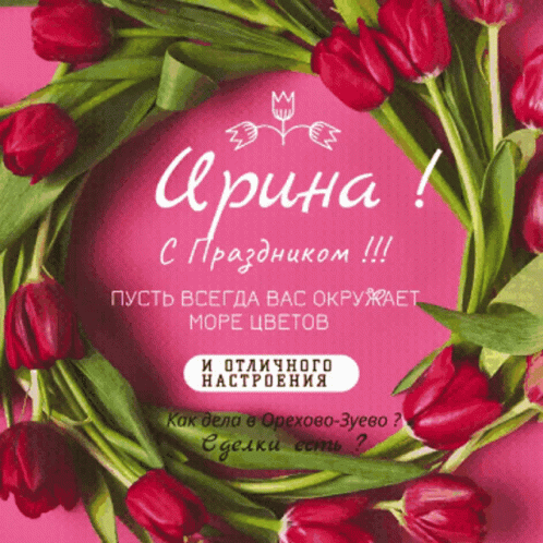 A vibrant pink greeting card featuring a wreath of red tulips, wishing Irina a Happy Holiday with a sea of flowers and a great mood.