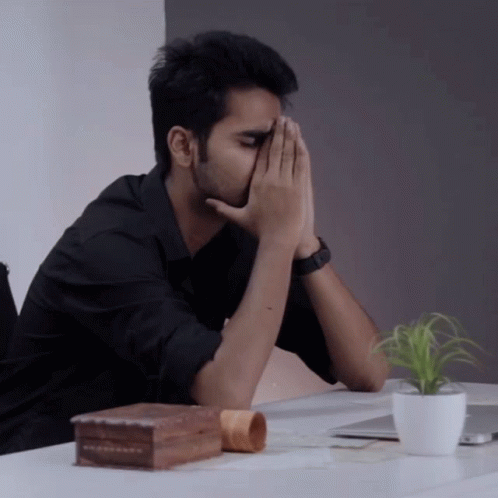 Sparsh looks freaked out, sitting at a desk with his hands on his face, as if waking from a bad dream.