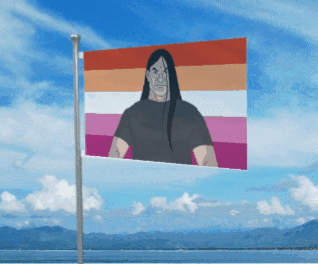 Nathan Explosion from Metalocalypse featured on a waving lesbian pride flag.
