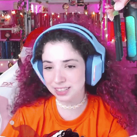 a woman wearing headphones and an orange shirt with the letter dx on the sleeve