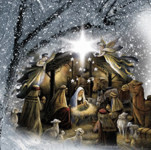A beautiful painting depicting the traditional Christmas nativity scene with Mary, Joseph, baby Jesus, angels, and animals.