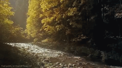 A serene river flows through a vibrant, sun-dappled forest, showcasing the beauty of nature.