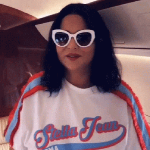 Nawal, wearing white sunglasses and a 'Stella Jean Roma' shirt, blows a kiss from inside a private jet.