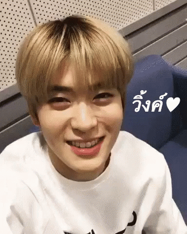Jaehyun NCT smiles and winks charmingly at the camera, wearing a white shirt and blonde hair.