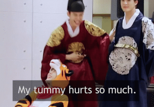 NCT members Doyoung and Jeno in traditional attire, with one in a tiger costume saying 'My tummy hurts so much'.
