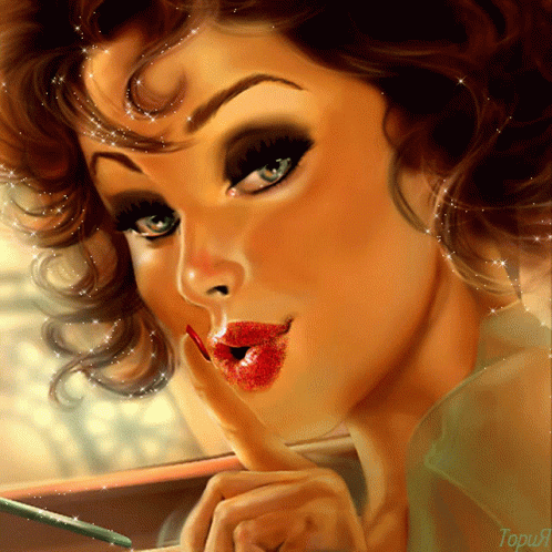 A retro pin-up style illustration of a woman with red lips and blue eyes, shushing with a finger to her mouth.