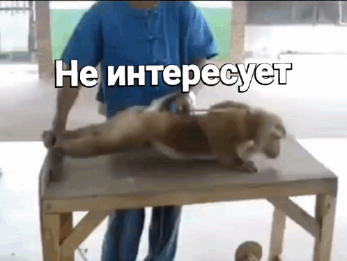 A man handles a monkey on a wooden table, with a meme caption 'Not interested' overlaid.