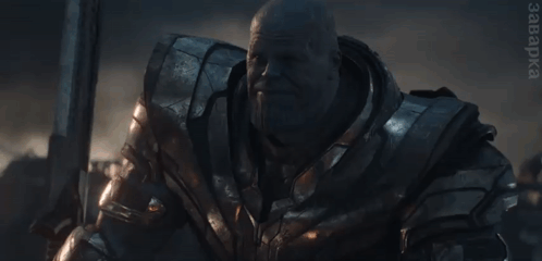 Thanos from Avengers: Endgame, armored and speaking, with Russian captions, reflecting on defeat.