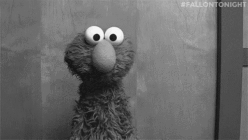 Elmo from Sesame Street looks around with wide, surprised eyes in a black and white clip.