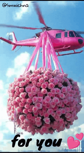 A stunning pink helicopter delivers a massive bouquet of pink roses, a beautiful gesture for someone special.