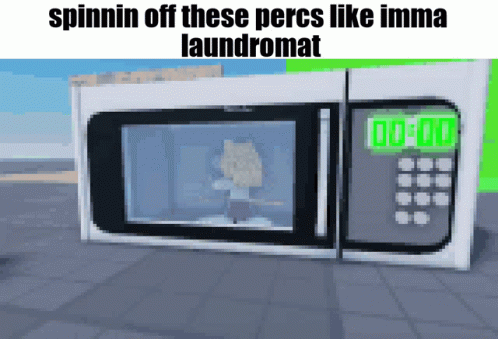 Neco Arc spins inside a microwave, accompanied by the caption 'spinnin off these percs like imma laundromat'.