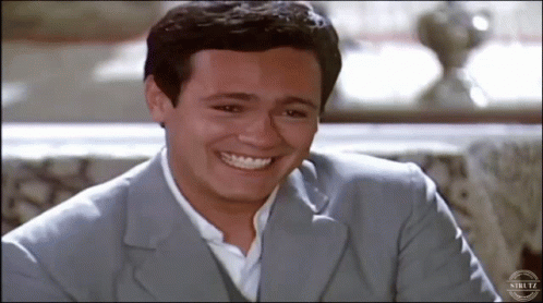 Neco, likely Danton Mello, smiles broadly in a light suit and white shirt, expressing happiness and emotion.