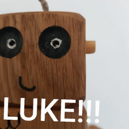 Ned The Robot, a wooden toy, with 'LUKE!!!' written on it, possibly from Rudi And Bear.