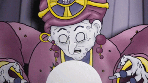 A cartoon fortune teller with a crystal ball, featuring characters Neebs, Hank, and Jed from Doraleous And Associates.