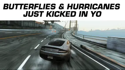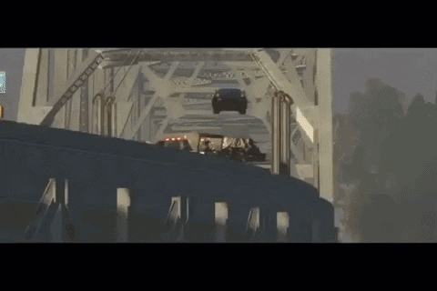 A black Datsun 240Z from Need For Speed performs stunts, including a jump over a bridge.