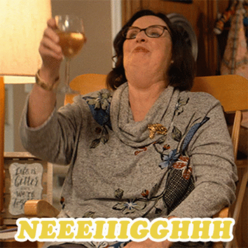 Phyllis Smith as Delores from Barb and Star Go to Vista Del Mar, raising a glass of wine and exclaiming 'Neeeiiigghhh!'
