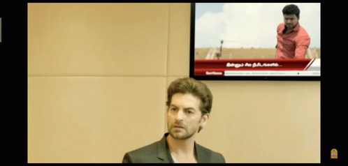 Neil Nitin Mukesh reacts to a news report featuring Vijay on a TV screen displaying 'Chennai News'.