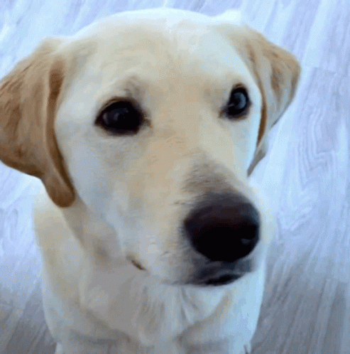 A cute light-colored dog, possibly a Labrador or Golden Retriever, looks directly at the camera with big, dark eyes.