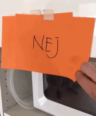 An orange paper sign with 'NEJ' (No) is taped to a microwave, indicating a restriction.
