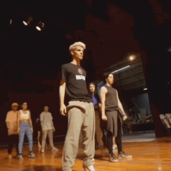 Nelson Carreras and Jamie showcase their dance moves, including high heel choreography, on stage with a group.