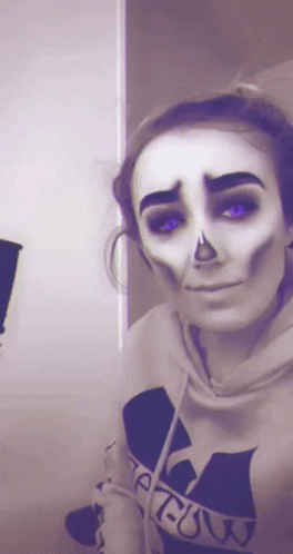 A woman with skeleton makeup and purple eyes transforms into a scary, red-lit creature, perfect for Halloween.