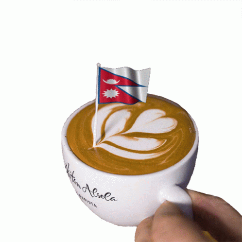 Dritan Alsela's coffee cup featuring beautiful latte art and a Nepal flag.