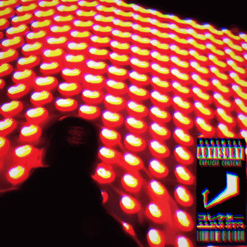 A person's silhouette stands before a wall of intensely red and yellow lights, creating a blurred, glitchy aesthetic.