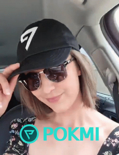 Nephael in a car, wearing a Poken Cap and sunglasses, smiling with the Pokmi logo visible.