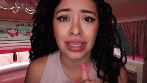 Merith Aranda appears nervous and uneasy in this ASMR video, set against a pink Hello Kitty themed background.