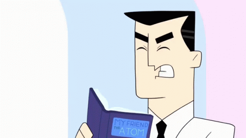 Profesor Utonio looks stressed and nervous while reading a book titled 'My Friend the Atom'.