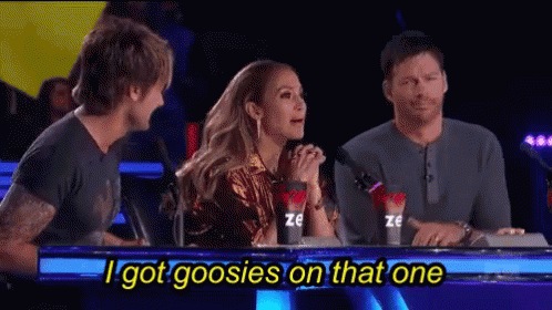 Jennifer Lawrence reacts with 'goosies' to a performance, showing a nervous yet moved expression.