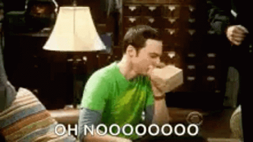 Sheldon Cooper, portrayed by Jim Parsons, hyperventilates into a paper bag, exclaiming 'Oh Noooo!'.