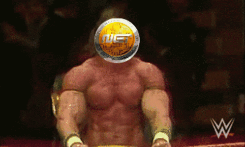 Muscular wrestler with a Netcoin crypto coin on his head, flexing in a wrestling arena.