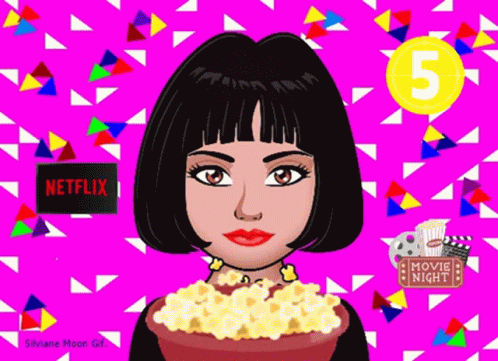 Silviane Moon cartoon avatar enjoys popcorn during a Netflix movie night countdown.