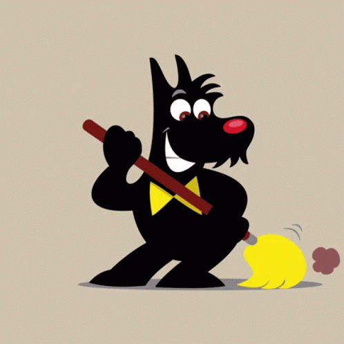 Netto Scottie, the cheerful cartoon dog, is diligently cleaning with a mop, representing Netto Deutschland.