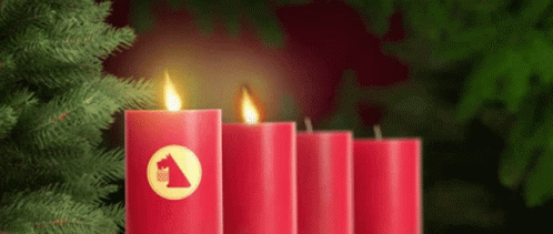 Two red Advent candles with the Netto Scottie logo lit, surrounded by green Christmas tree branches.
