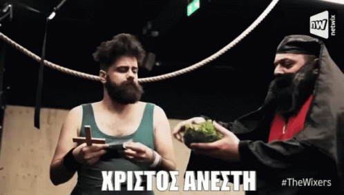 Labropoulos and Passas celebrate Easter at the gym with a 'Christ is Risen' blessing.