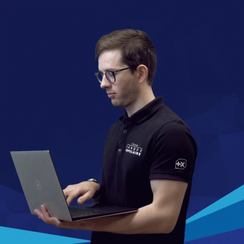 Nicolas Ferellec, part of Team Banque Populaire, works on a laptop, focusing on network and sailing tools.