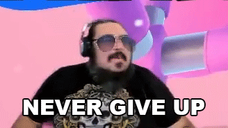 Agbin3r, a man with a beard, headphones, and sunglasses, delivers an inspiring "Never Give Up" message.