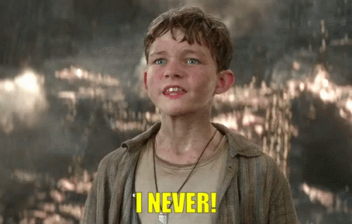 Levi Miller, as Peter Pan, defiantly exclaims 'I Never!' against a dramatic, dark background.