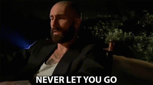 Adam Levine, with a beard, sings 'Never Let You Go' in a dimly lit setting.
