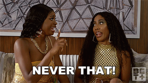 Coco Jones and Sevyen Streeter react with a firm "NEVER THAT!" while sitting on a couch.