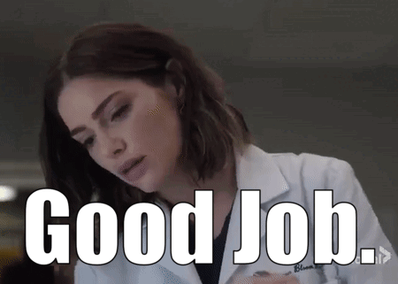 Lauren Bloom from New Amsterdam, played by Janet Montgomery, saying 'Good Job' in a lab coat.